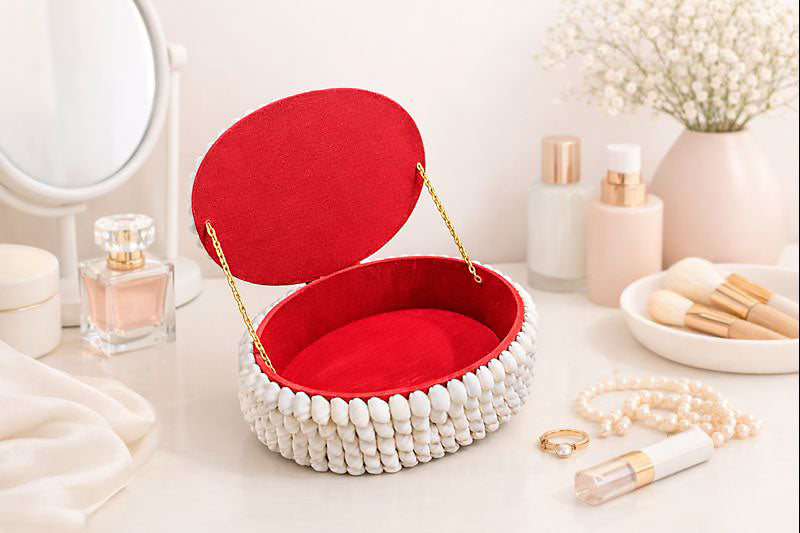Handcrafted shell vanity box designed as a statement piece for dressing tables, shelves, or special occasions.