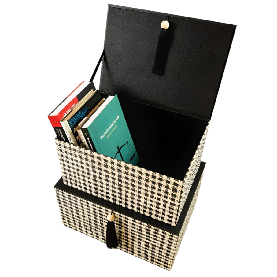 Set of 2 storage boxes that can double as decor.  Materials: Handcrafted from exquisitely woven raffia material with black quality faux leather lid and finished with an elegant black tassel.  Community: Lovingly handcrafted by local artisans keeping the raffia weaving tradition alive. Raffia material sourced and produced locally and sustainably.  Dimensions: Medium - 13.5 x 9.7 x 7.25h" (1.2kg) Large - 15 x 11.2 x 8.2h" (1.5kg)