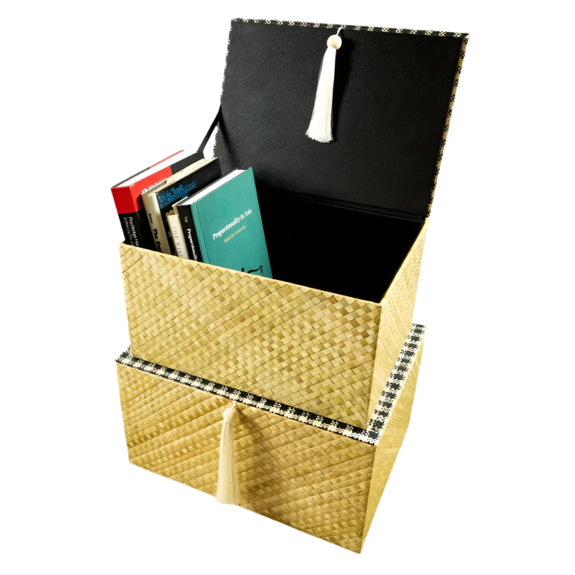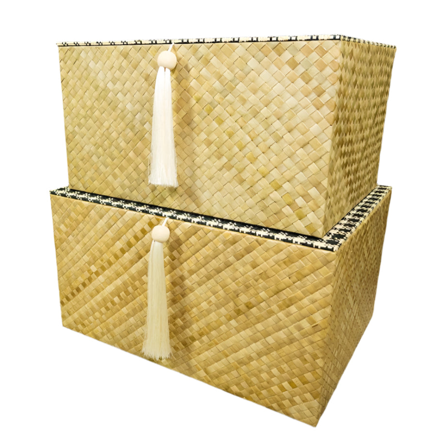• Materials: Handcrafted from exquisitely woven natural pandan with checkered raffia lid and finished with an elegant white tassel.