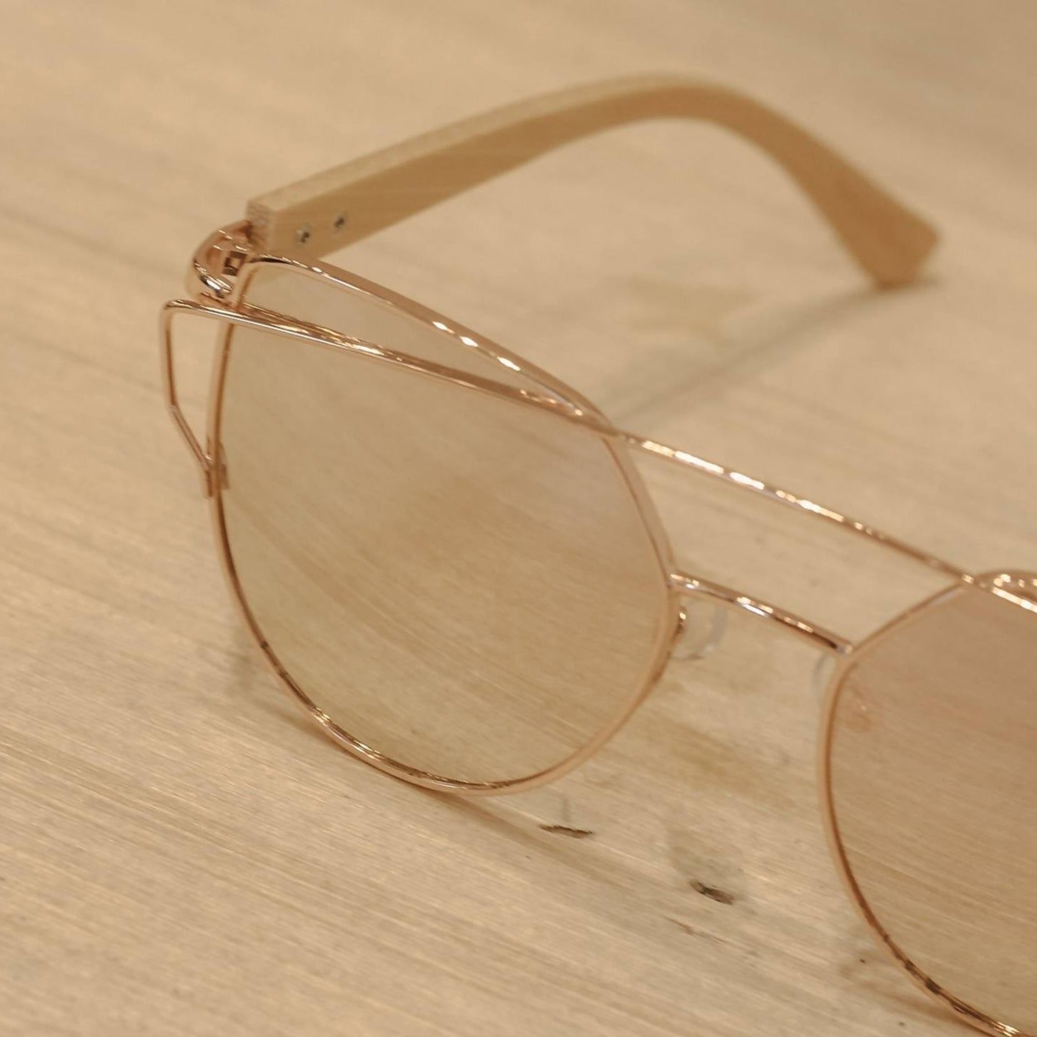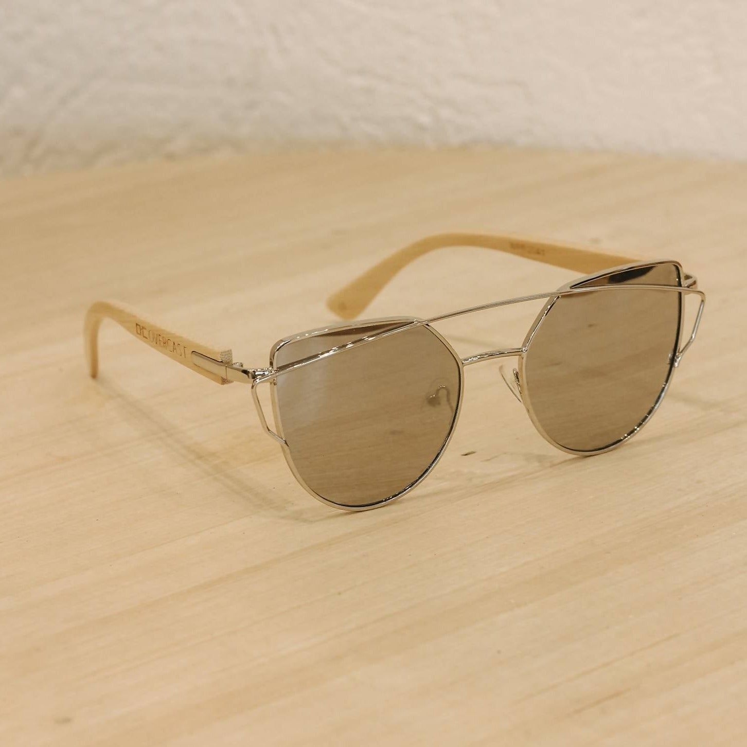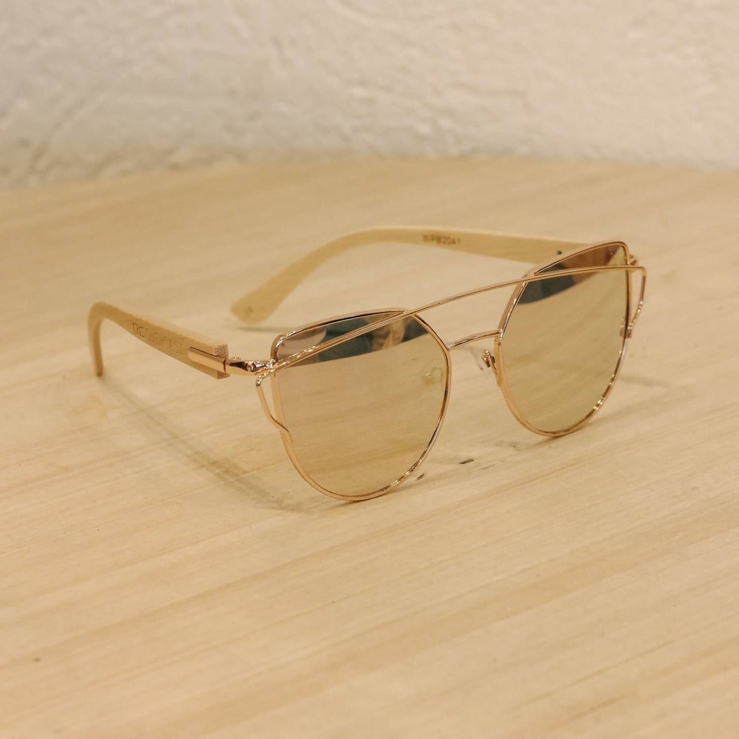 Sustainable wooden cat-eye sunglasses. • Made with sustainably sourced bamboo temples• Double-bar bridge• Metal spring hinges • Polarized lenses with UV400 protection Lens - 53 mm | Bridge - 23 mm | Temple - 130 mm