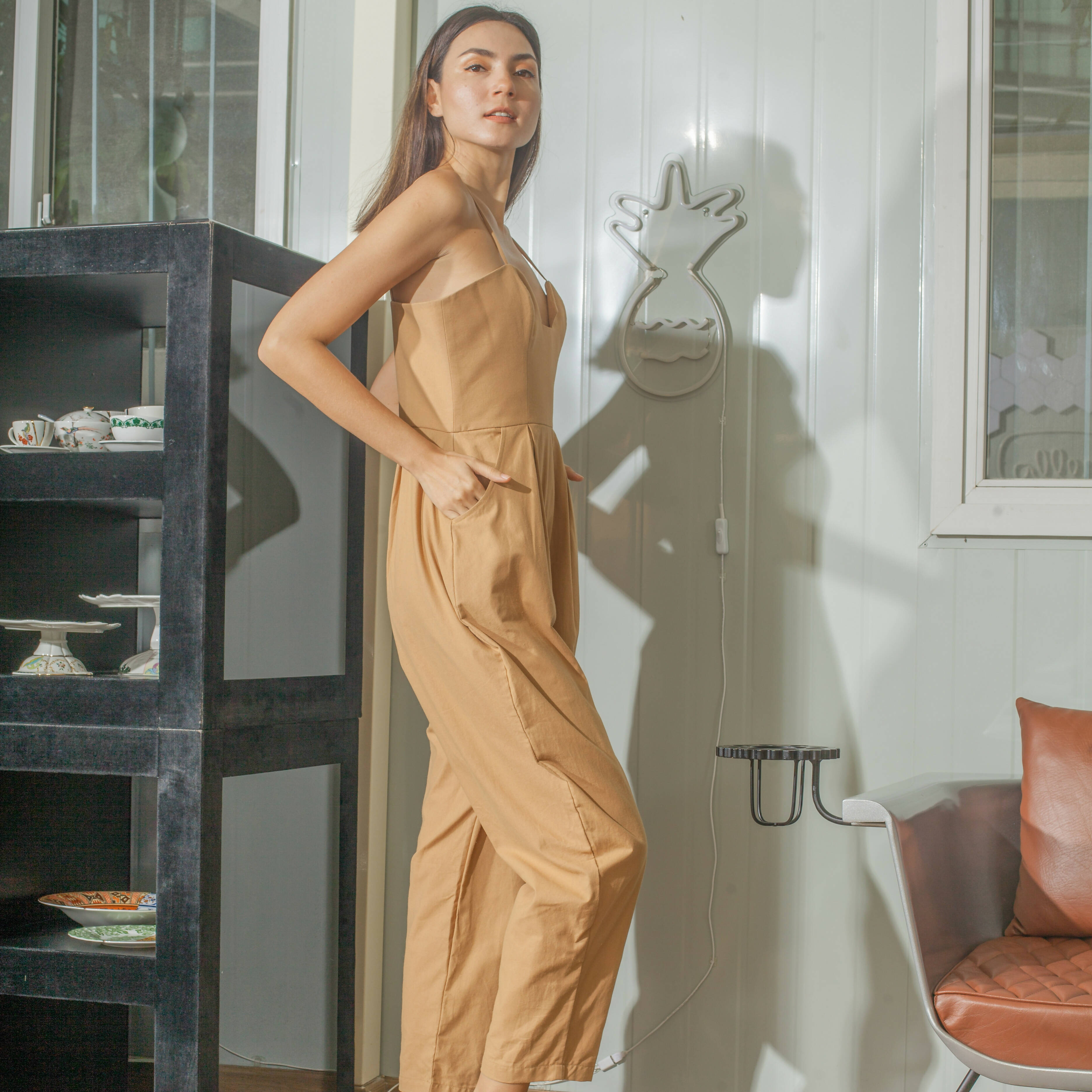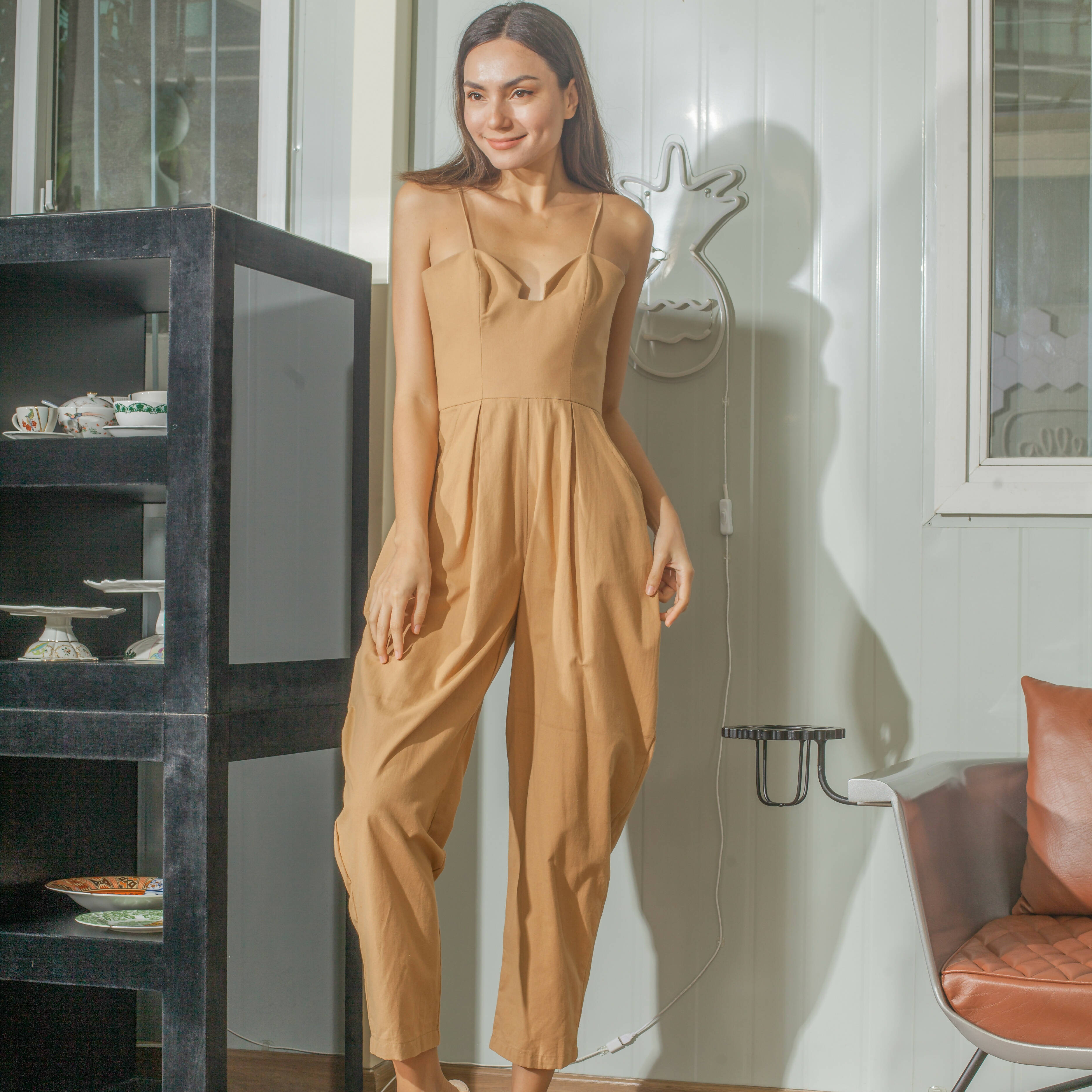 Your season statement piece.  Your favorite sweetheart neckline in an accentuated cutout paired with your favorite baggy jumpsuit design.  A must-have piece that comes in a number of colors and fabrications with tweaked details per variant from half-lined fitted bodice to fully lined. Pair with our crop tops and your favorite sneakers, sandals or high heels – creating different styles is endless for brunch, lunch, happy hour or fab dinner with the girls and even doing virtual presentations. Style: Women’s Jumpsuit Available in 7 Autumn Linen Colors: Nude, Dark Tan, Mustard, Dark Brown, Copper, Dark Emerald and French Navy Accentuated Sweetheart Neckline, Spaghetti Strap, Baggy Jumpsuit, Back zip closure, 2-Pocket Design Fabric Composition: 100% Linen, Lightweight Fabrication Care instructions: Gentle hand wash or dry-cleanable  Size Chart: S: Bust 34”, Waist 27”, Hips 37” M: Bust 37”, Waist 30”, Hips 40” L: Bust 40”, Waist 33”, Hips 43” Length from shoulder to hem: 54.5” as worn by model    Model's measurements are 5'10" and 31-24-35. Model is wearing small.