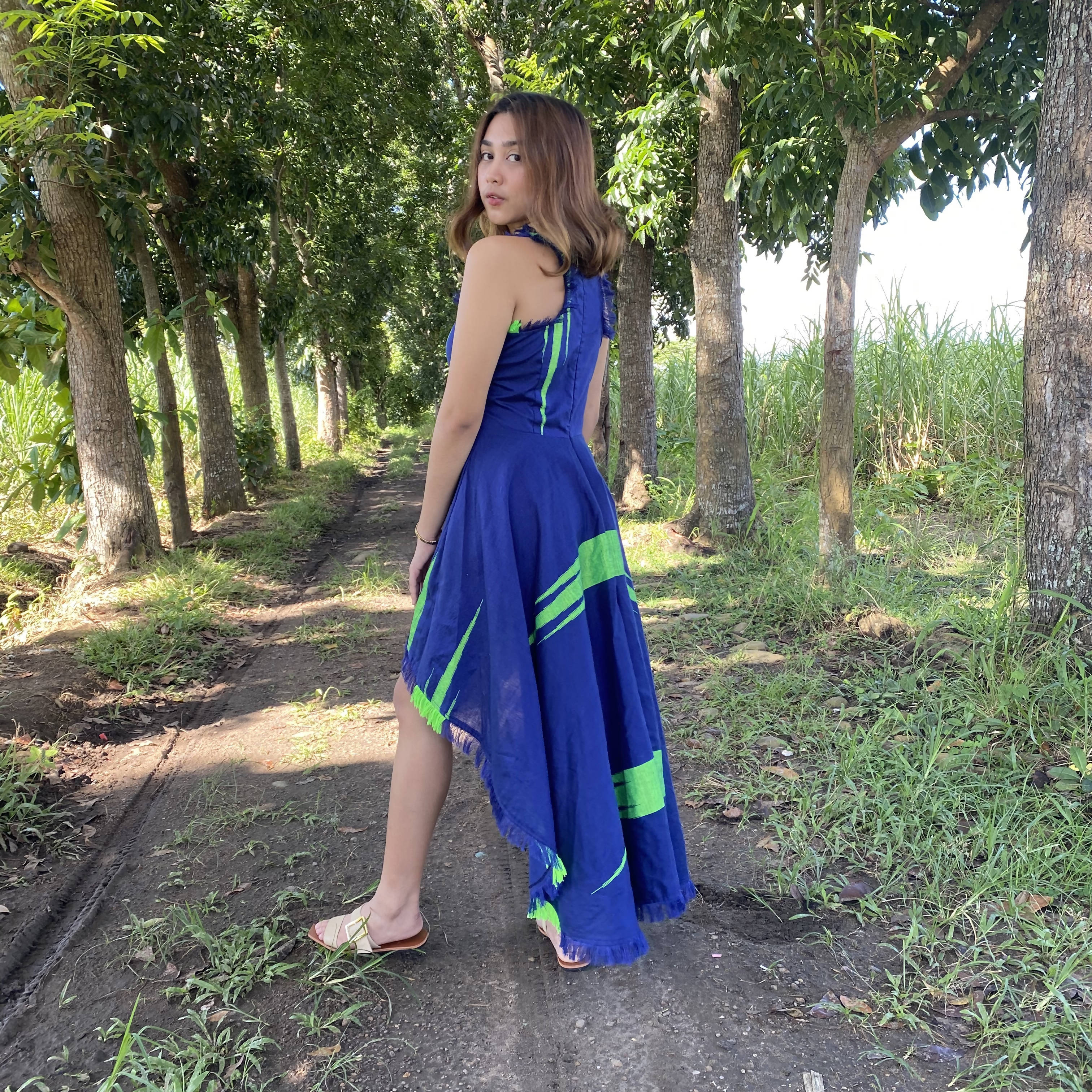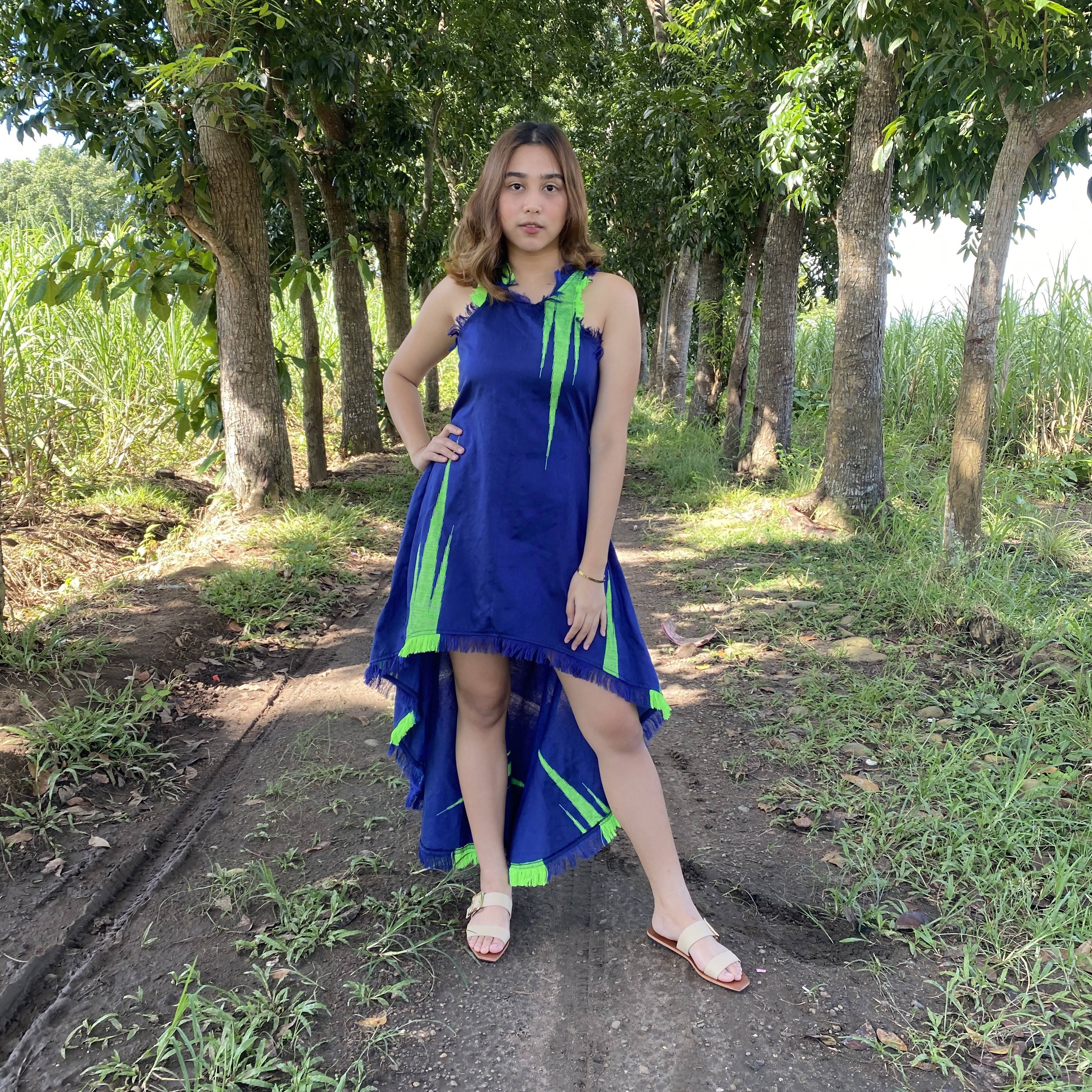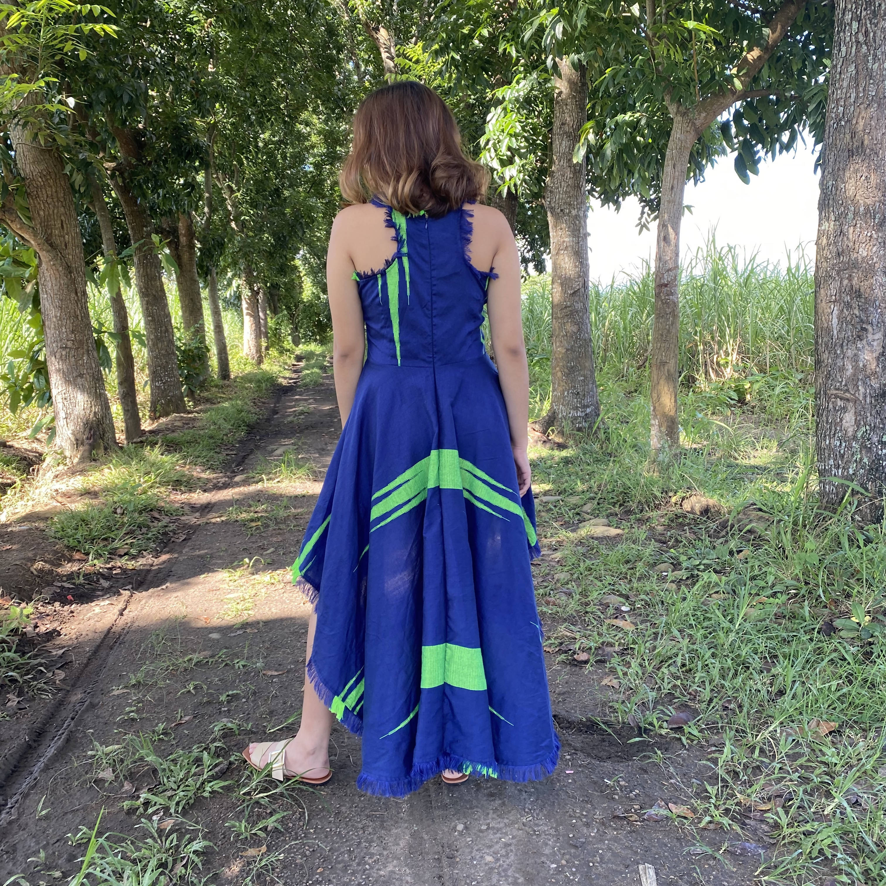 Bold and beautiful Tanya, VHayes designs this dress as a standout. A bold combination of royal blue and lime green patterned of twelve-string abstract handwoven by  Negros Island - Philippine Weavers. This beautiful dress features a side zipper and edgy tassel to add an ethnic feel to it. Pair the dress with bold statement earrings and a clutch for a memorable look.