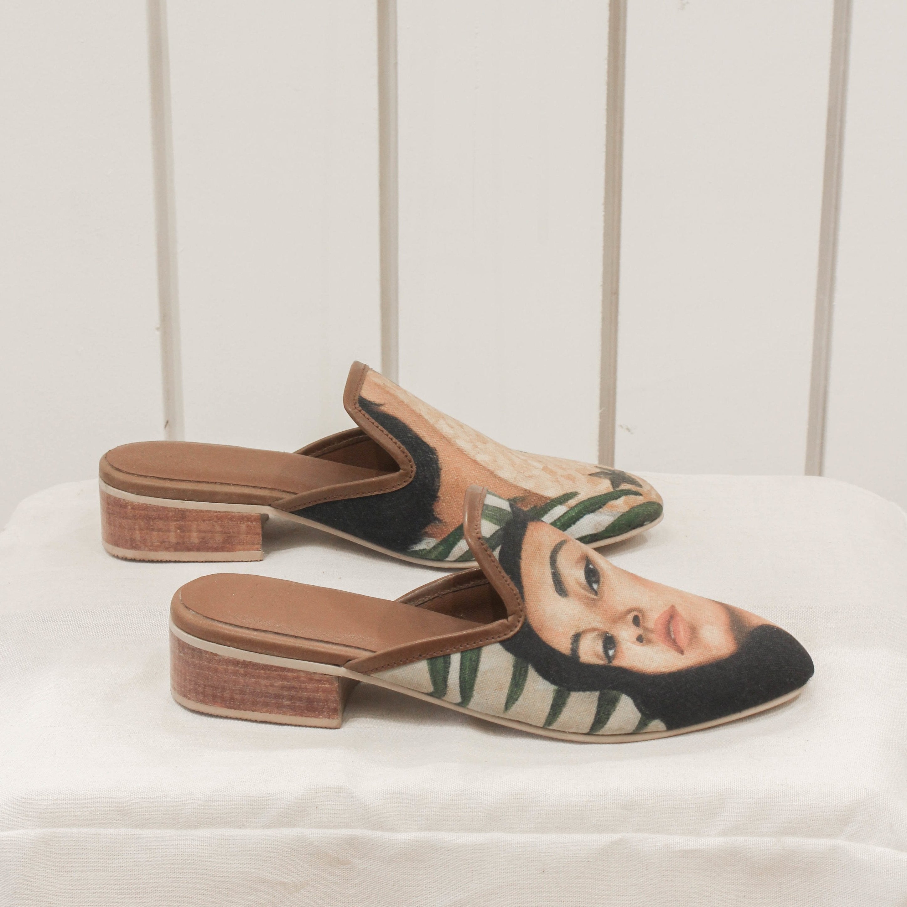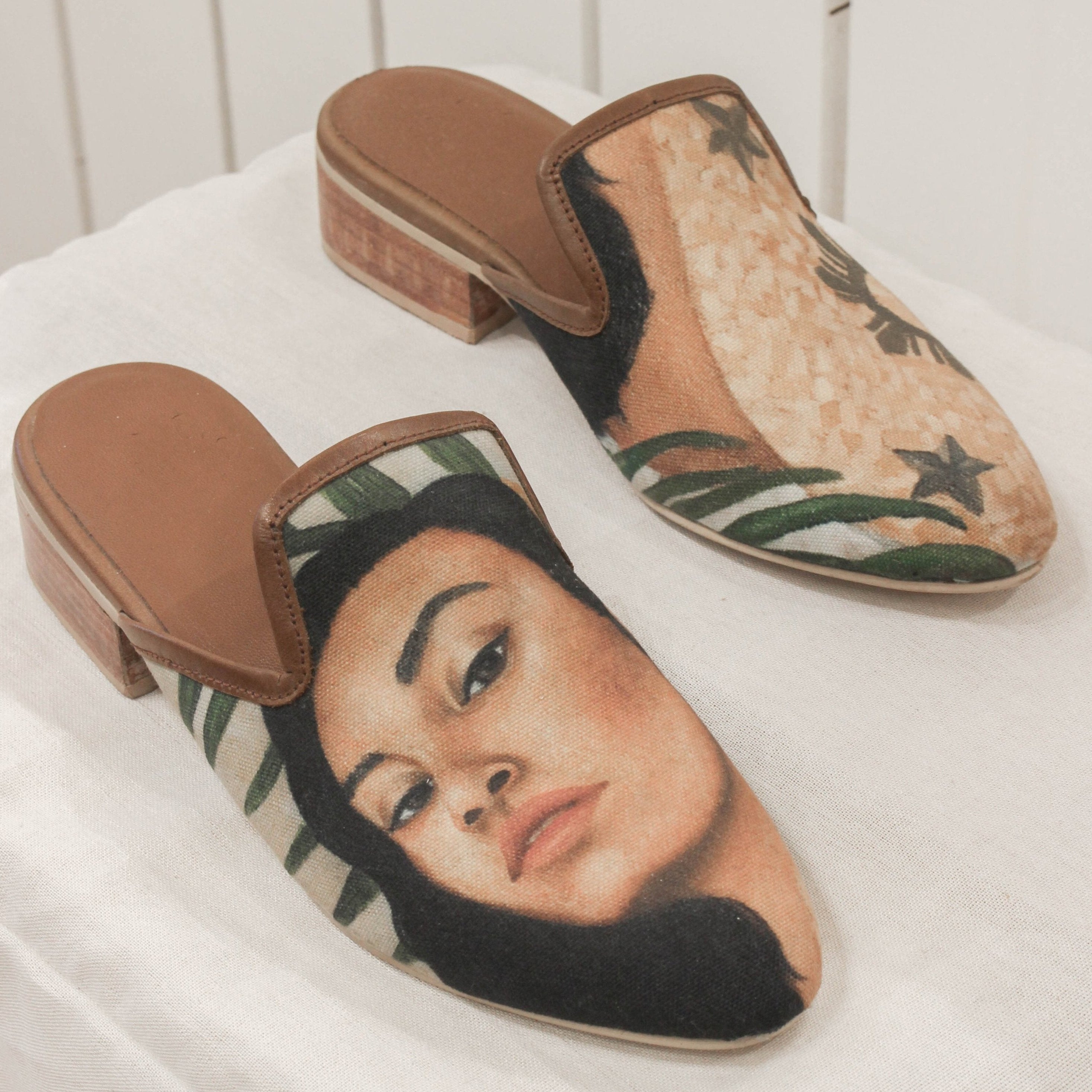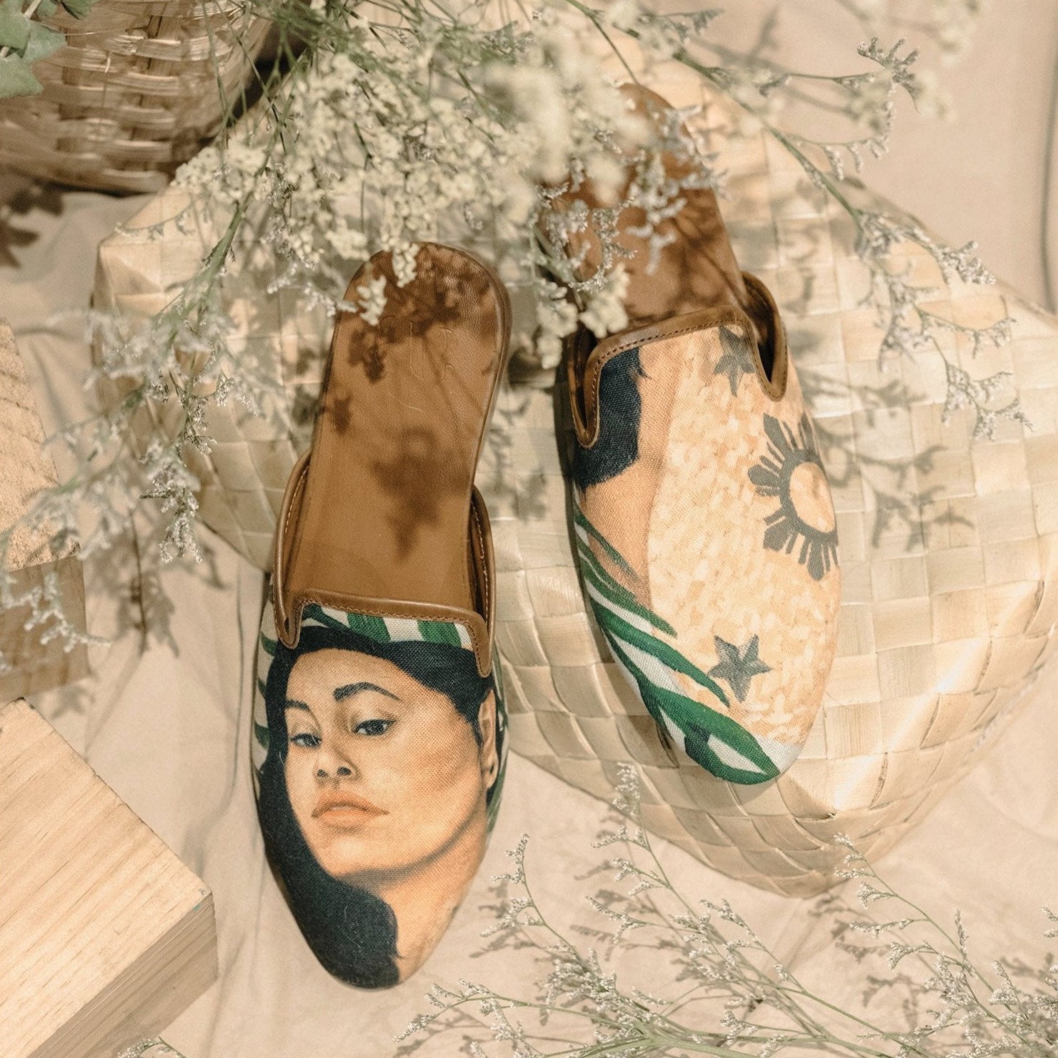 Elevate your footwear collection with our exquisite mules, featuring a stunning oil-on-canvas painting by Filipina artist Alelia Ariola, as part of her inspiring "Kayumanggi Collection". This unique artwork is meticulously transferred onto high-quality canvas, with genuine leather piping adding a touch of sophistication and durability.
