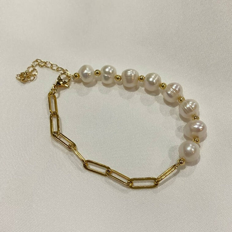 Freshwater Pearl Bracelet Material: Gold Plated Paper Clip Chain Length: 8 inches Shape: Potato Size: 8-9 mm Spacer: Gold Plated Balls