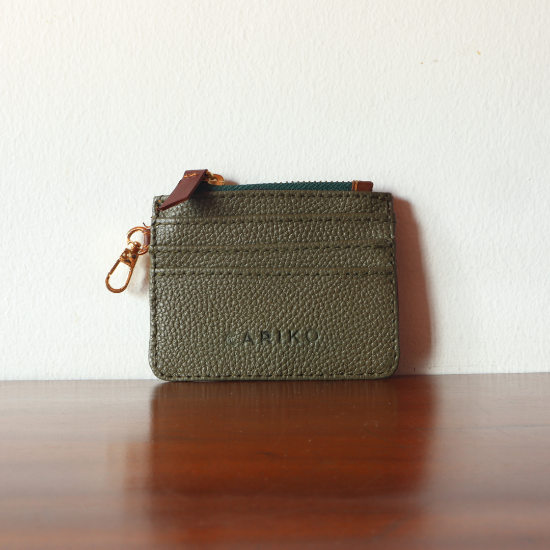The Tia Cardholder is a compact, handcrafted wallet made from genuine cowhide leather. It features multiple card slots, a secure zip compartment for coins or bills, and a side clasp hook for easy attachment to a lanyard, key ring, or bag.