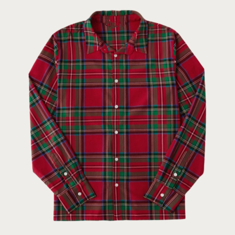 Men's red plaid button-down shirt crafted from a soft cotton-polyester blend. Designed with long sleeves, buttoned cuffs, and a classic fit—perfect for both holidays and everyday wear. Pairs perfectly with the Tinseltown Mommy & Daughter plaid dresses for a coordinated family look.