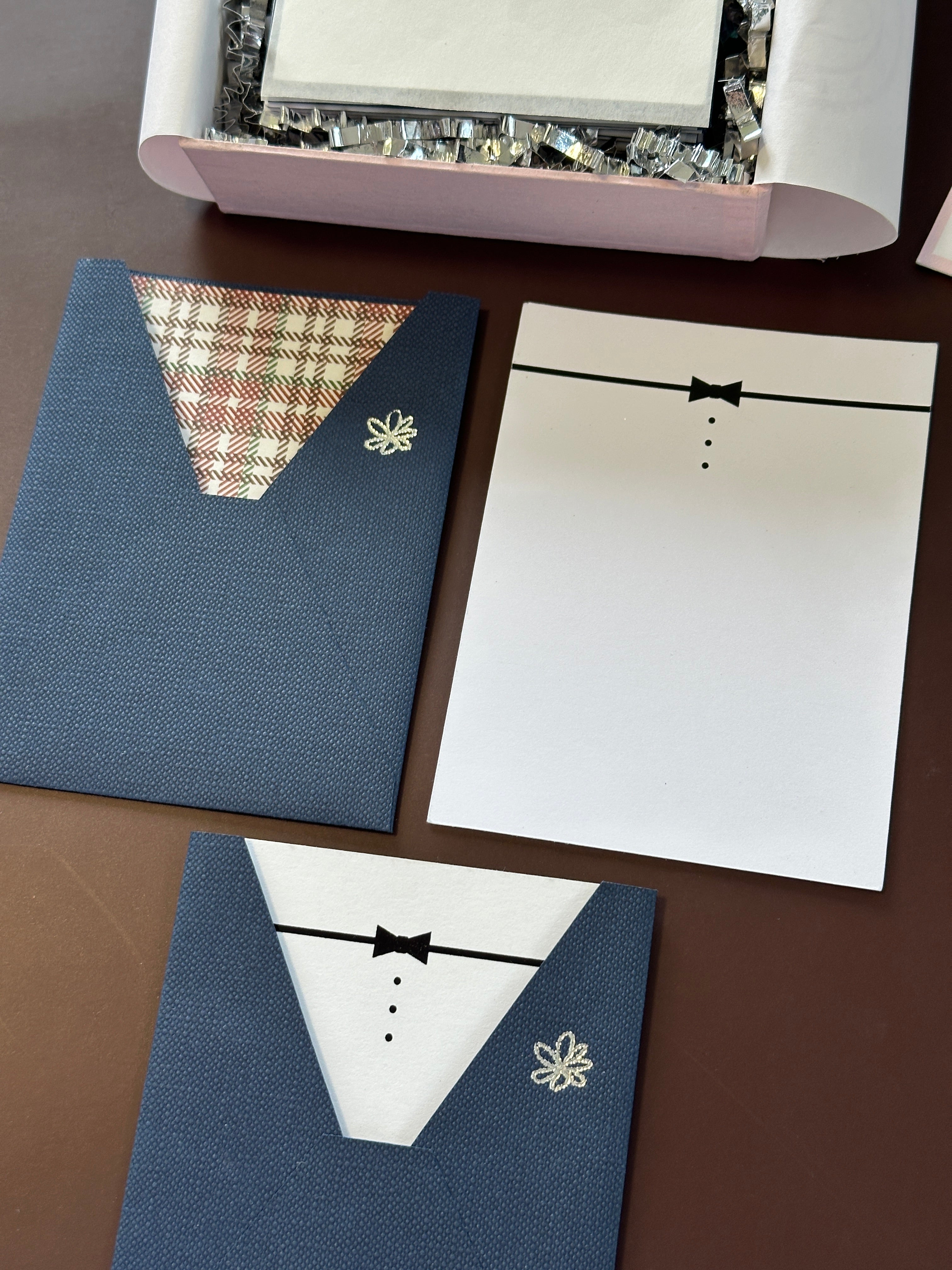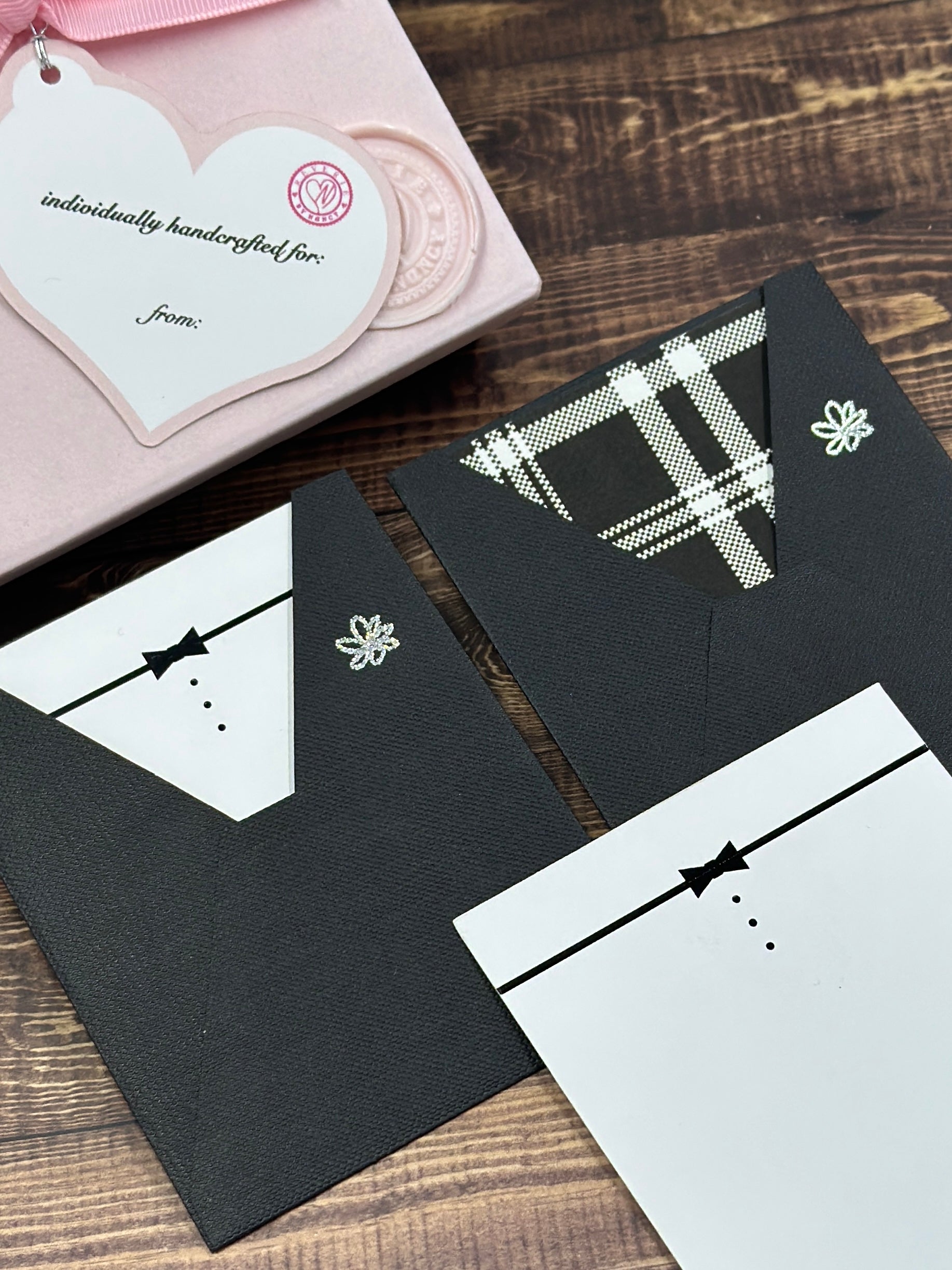 Each card features a sleeve with a foiled boutonniere, and a coordinating liner -- reimagining the classic tuxedo as stationery.