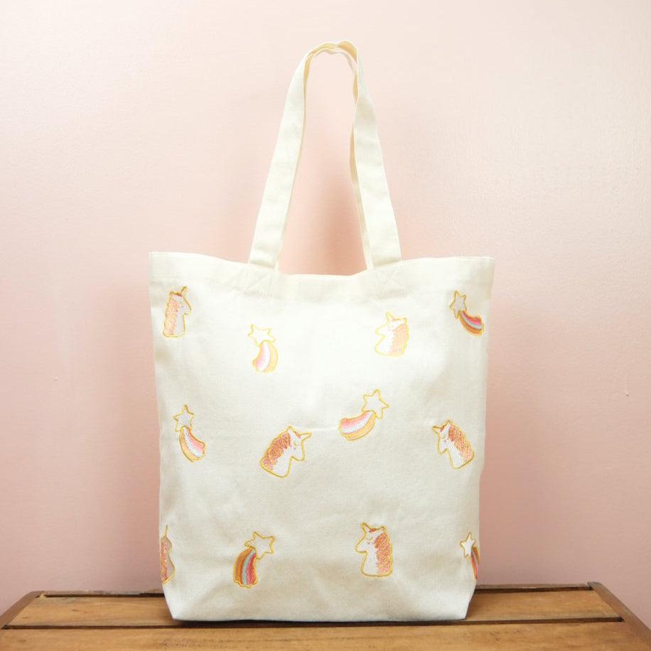 Unicorn and Shooting Stars on Natural Canvas Shoulder Tote
