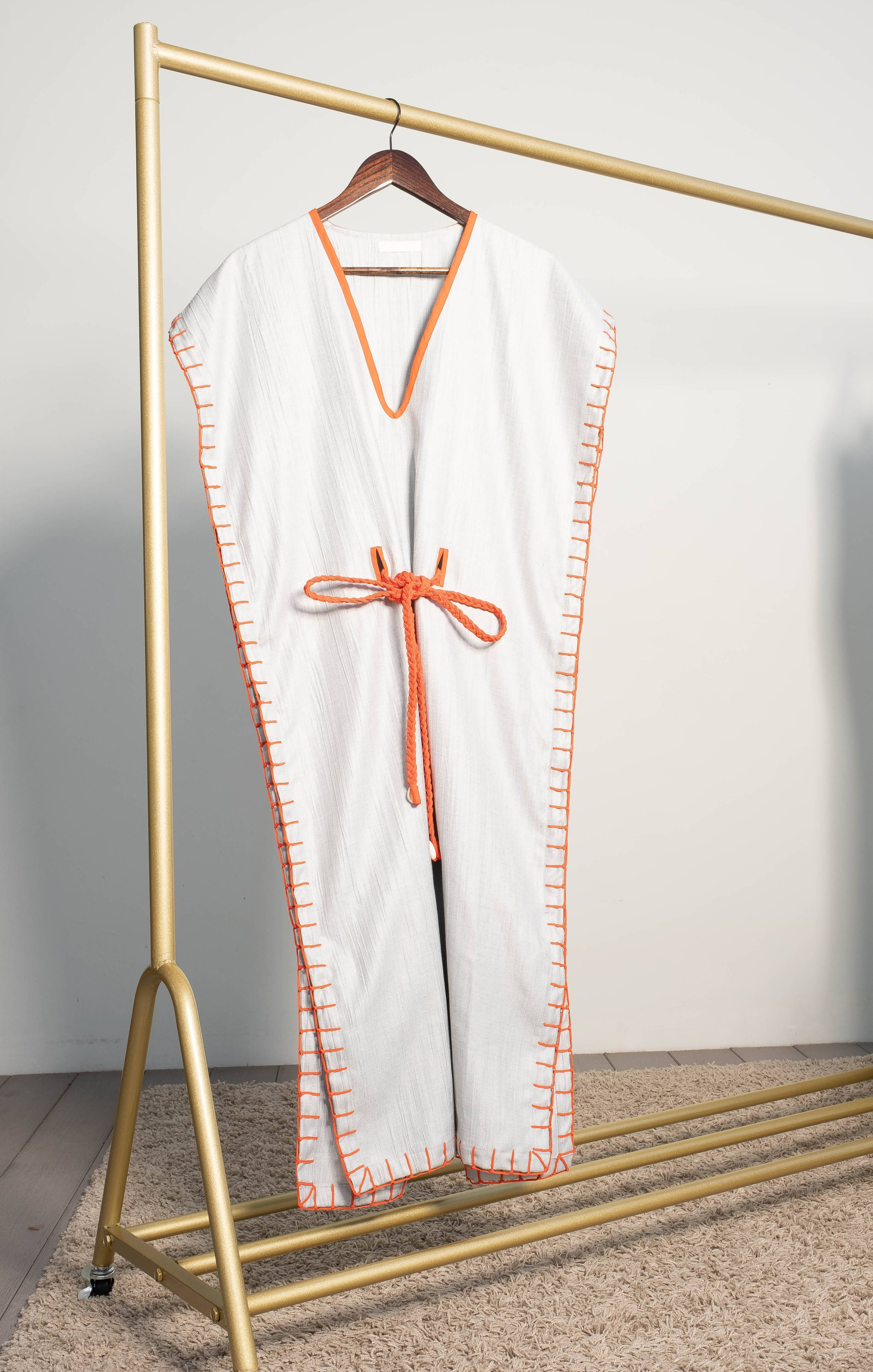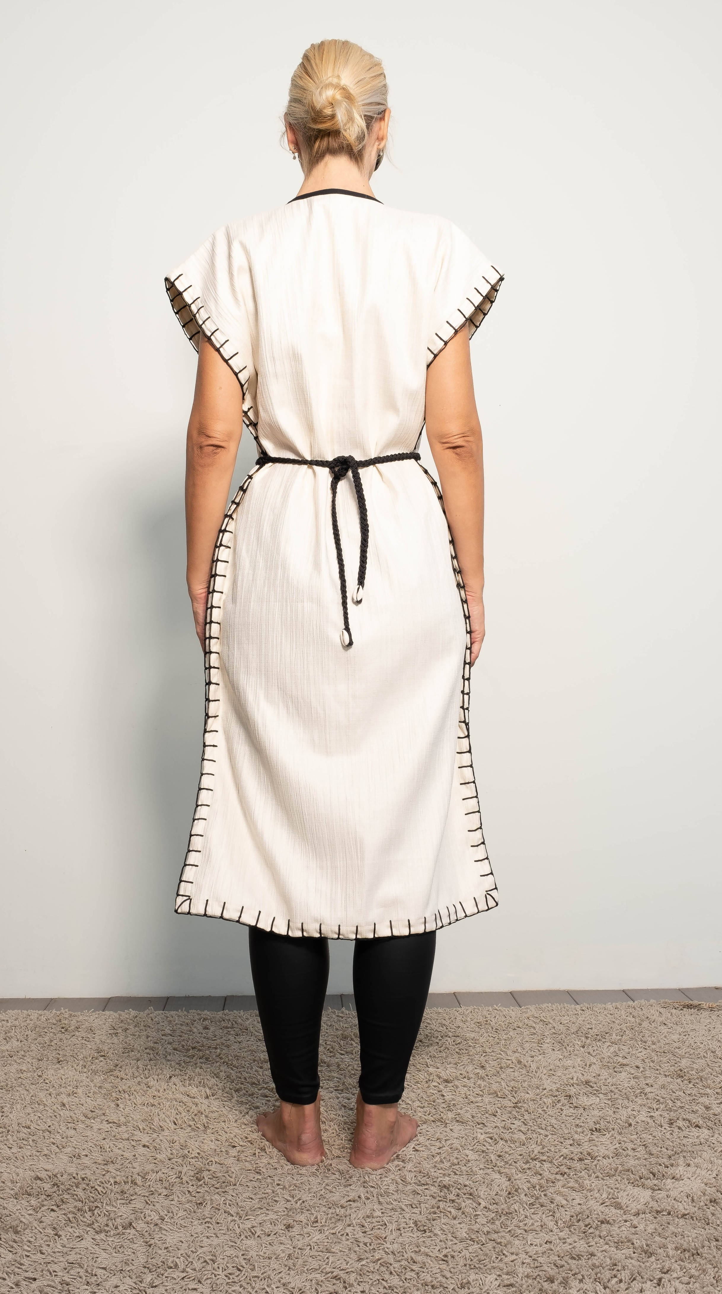 Our V Neck caftan is a structured rendition on this summer staple.  The intention behind this design is for our clients to look equally put-together while having an aperitif or walking on a beach. The V neck caftan is made from jacquard linen and has been sewn by a sole Cebuana seamstress.