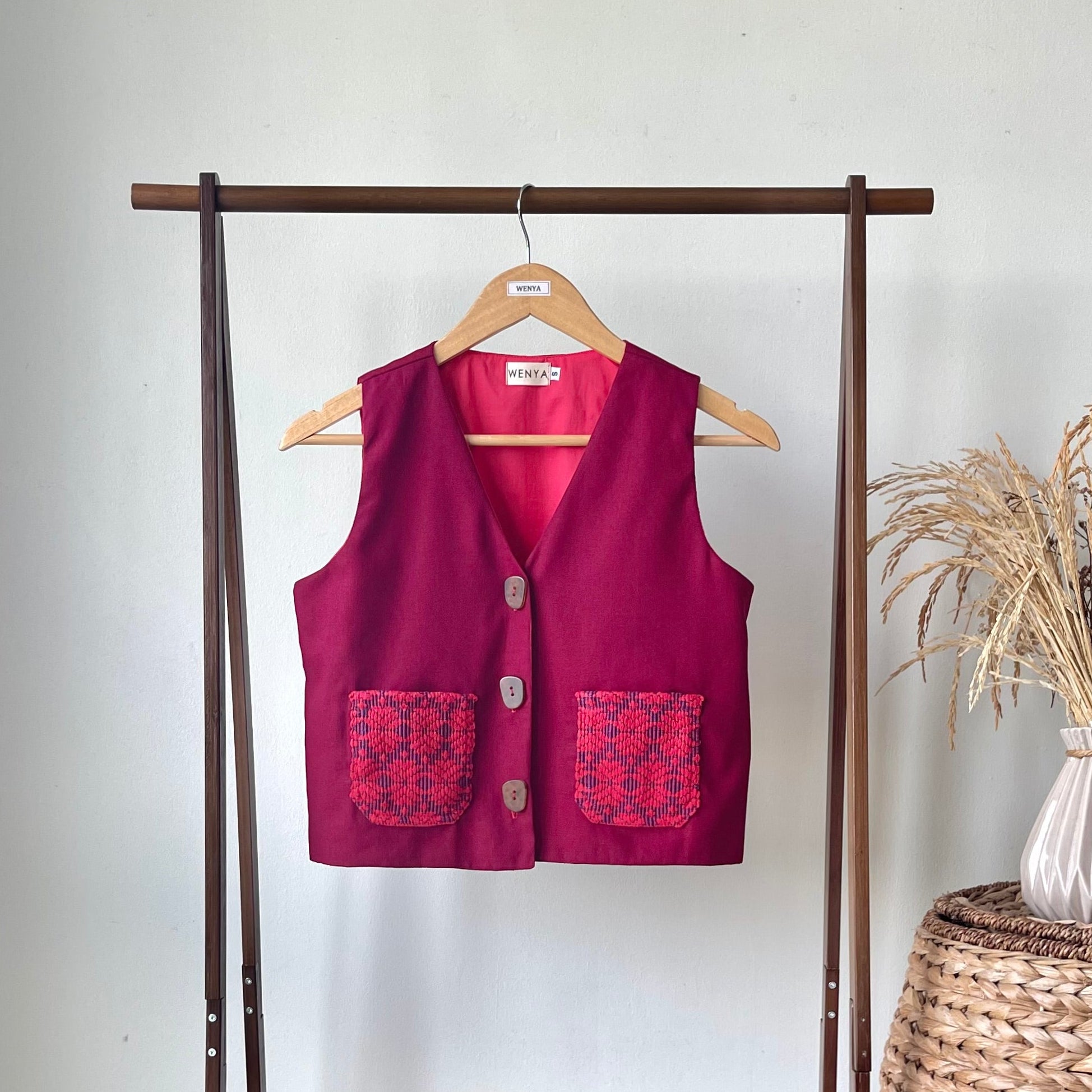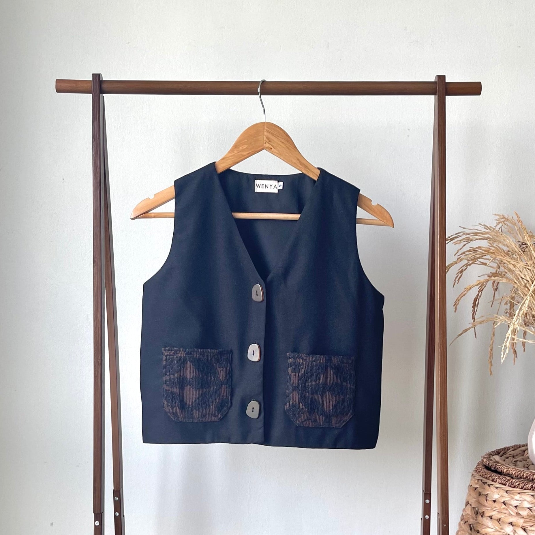 This tailored vest is all about perfect proportions, with a V-neckline that hits just right – not too low, not too high, accented with irregular-shaped buttons and Hablon-detailed pockets, adding a unique Filipino touch.                                                    Size SmallBustline: 36″Length: 18″Armhole: 18″ MediumBustline: 38″Length:19″Armhole: 19″ LargeBustline: 40″Length: 20″Armhole: 20″