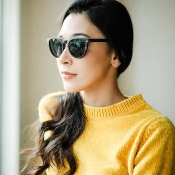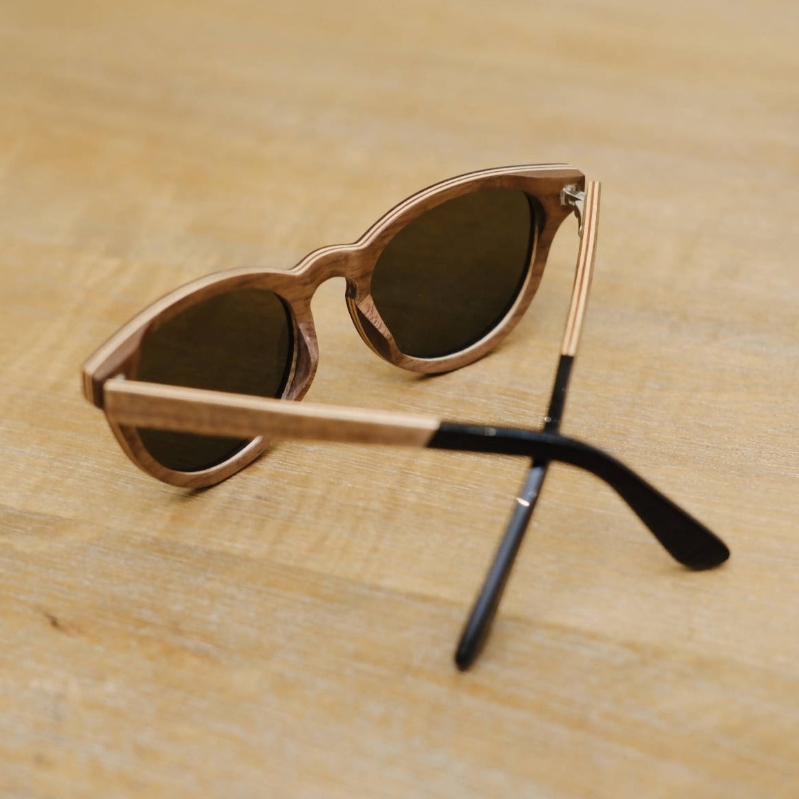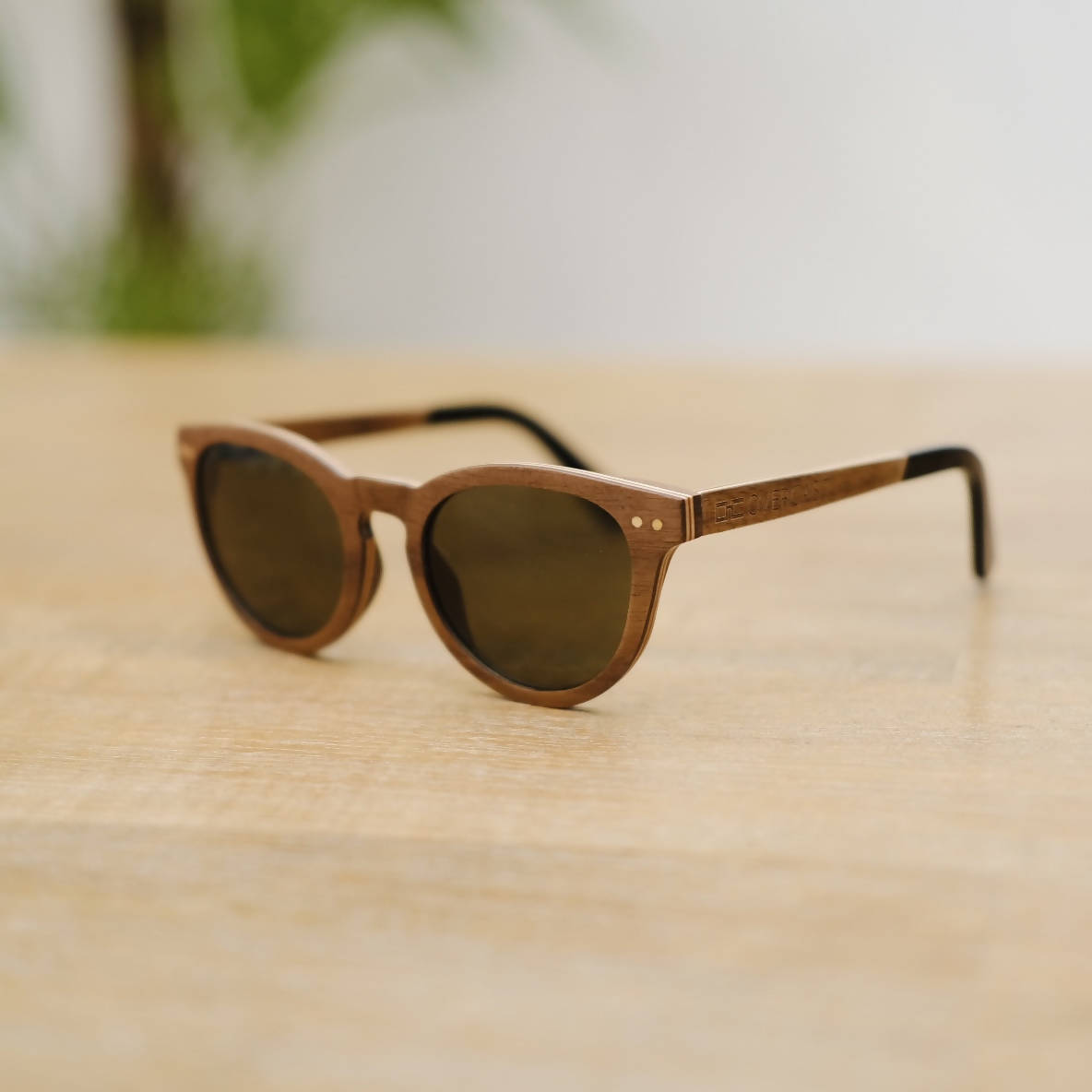 Sustainable wooden round sunglasses. • Made from sustainably sourced ebony/walnut wood• Two dot rivets on the front• Keyhole bridge• Metal spring hinges• Acetate end caps • Smoke polarized lenses with built-in UV protection Lens - 50 mm | Bridge - 20 mm | Temple - 140 mm