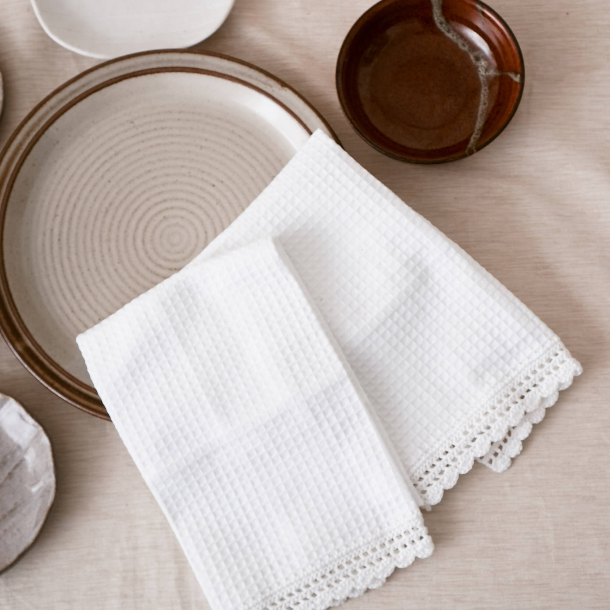 Our soft and absorbent white cotton waffle hand towels with hand-crocheted edging come in pairs.  They are a constant favorite! Size is 14 x 17-1/2".