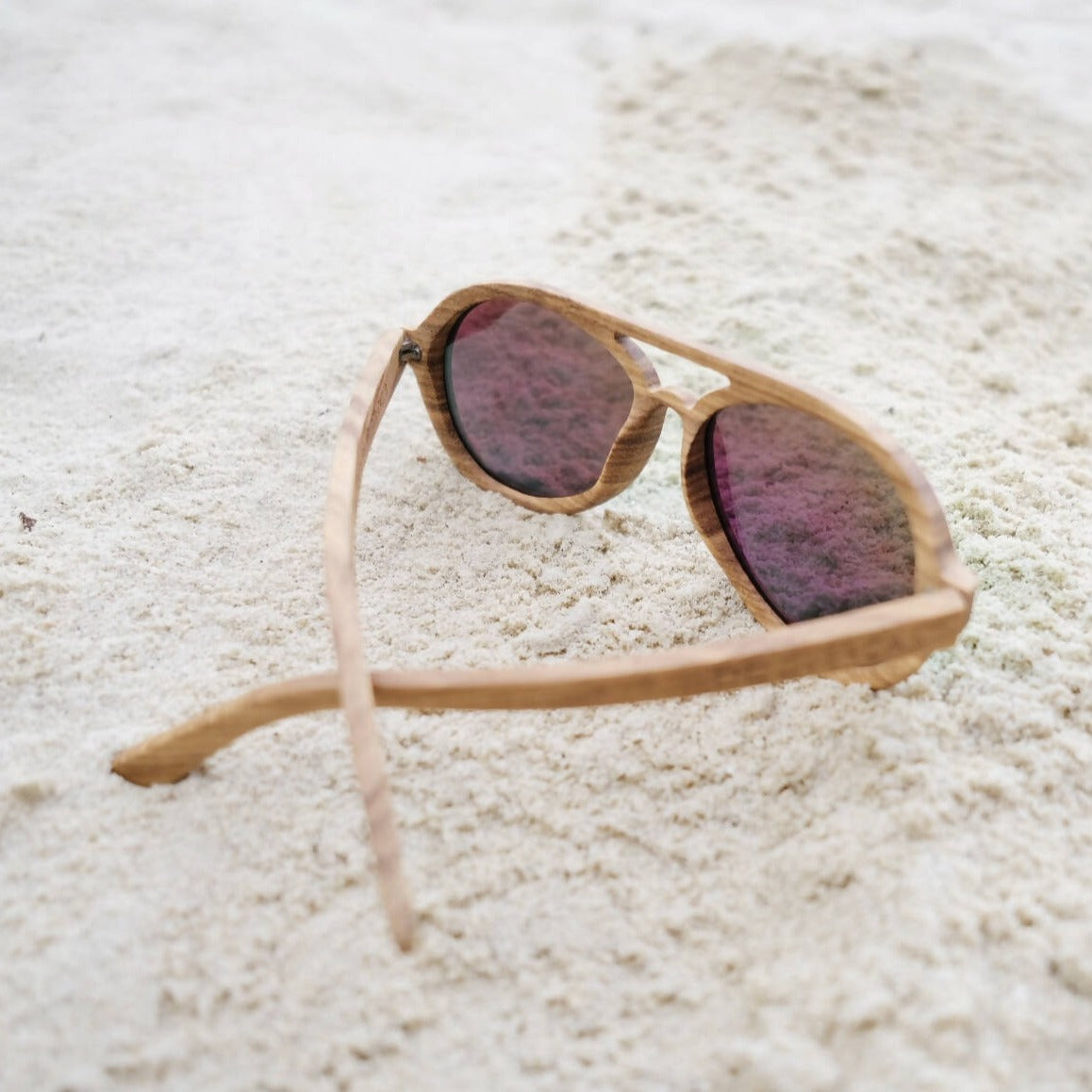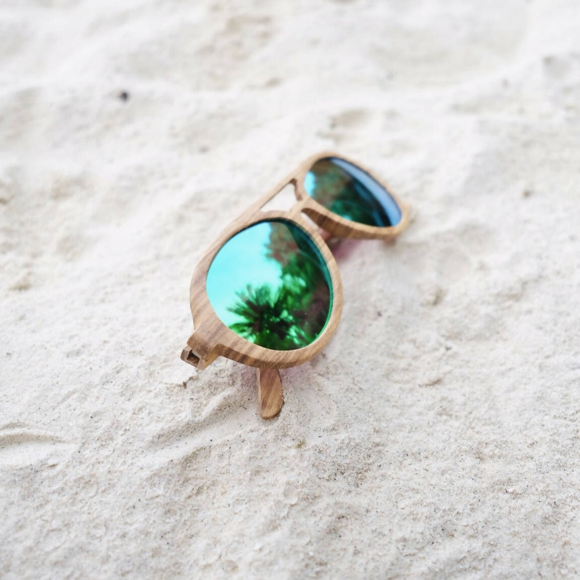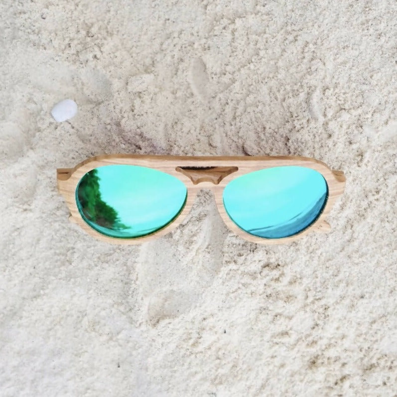Made from sustainably sourced bamboo featuring a double bar bridge, metal spring hinges and green polarized lenses with built-in UV400 protection. Size: Lens - 55 mm | Bridge - 20 mm | Temple - 140 mm