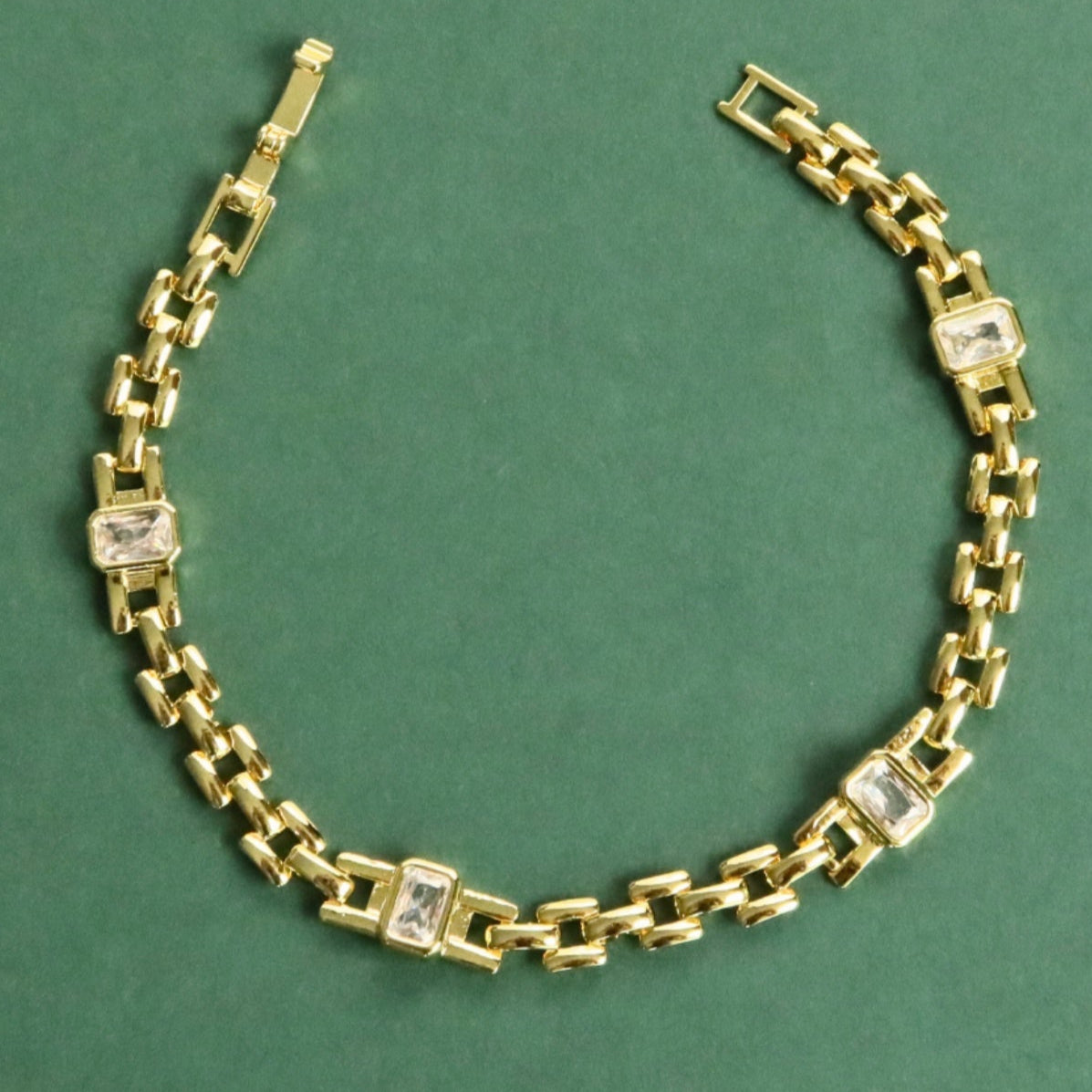 The watch chain bracelet with cubic zirconia combines the sleek and timeless design of a classic watch chain with the sparkle of cubic zirconia stones.