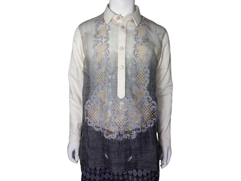 This long-sleeved white and gray barong beautifully merges traditional weaving and timeless embroidery. The base fabric is pineapple fiber (piña), known for its natural translucence and refined texture. The white sleeves are handwoven by the weavers of Julongan Village, Kiangan, Ifugao, carrying the heritage of indigenous craftsmanship.