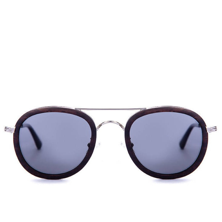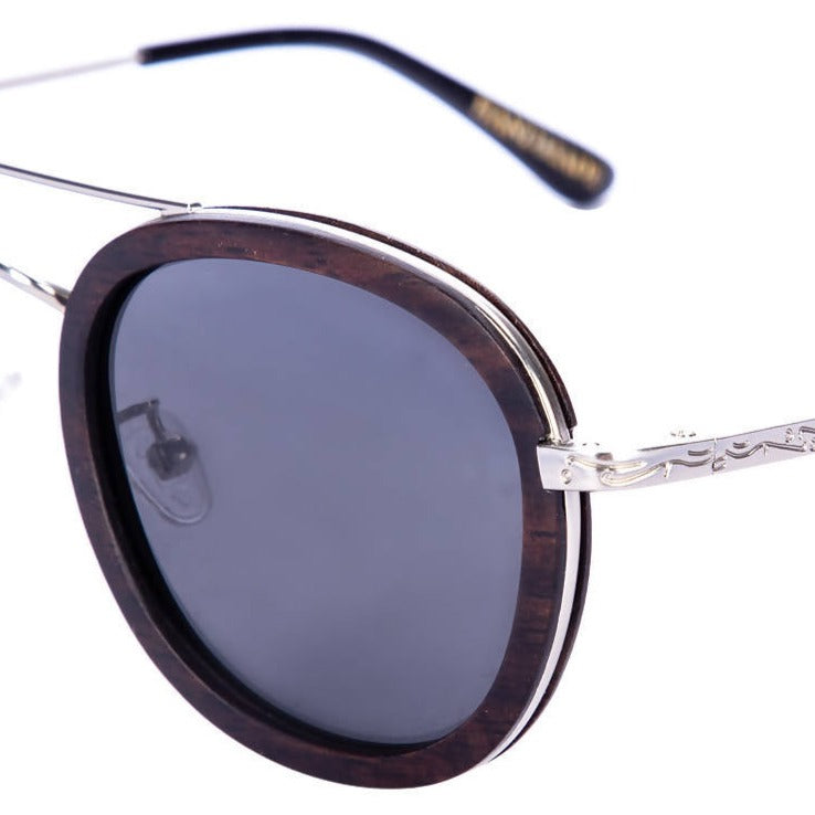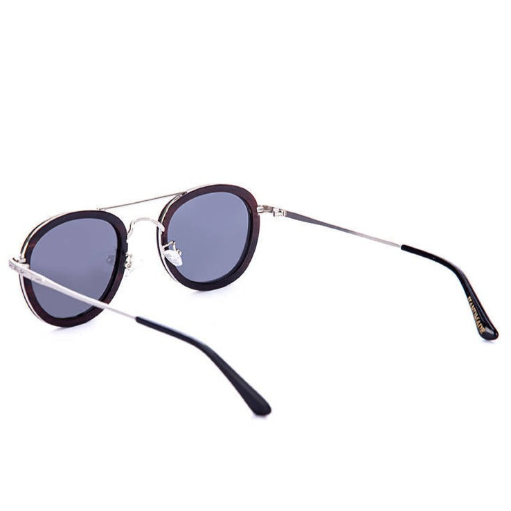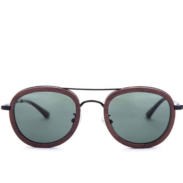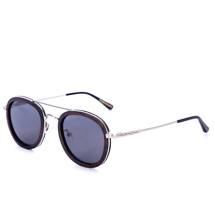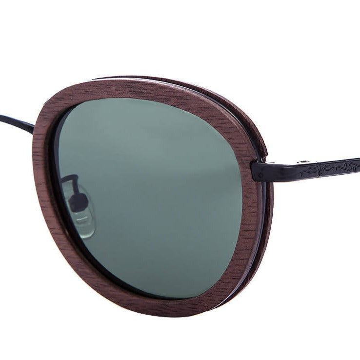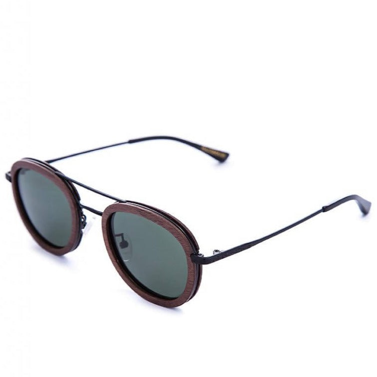 Sustainable wooden round sunglasses. • Made from a stainless steel and ebony/walnut wood combination frame• Double-bar bridge• Metal spring hinges• Acetate end caps • G-15 polarized lenses with built-in UV400 protection Lens - 46 mm | Bridge - 20 mm | Temple - 132 mm