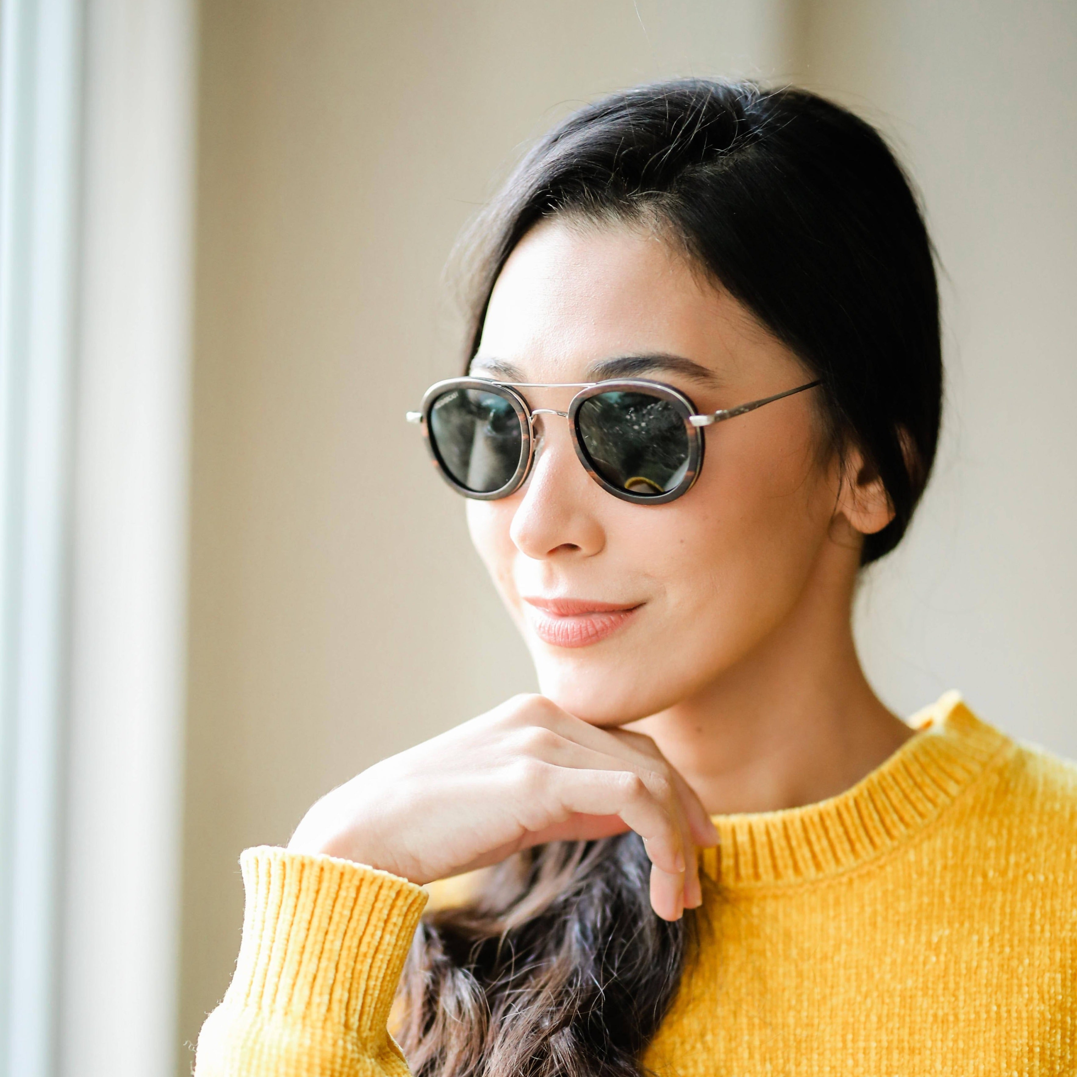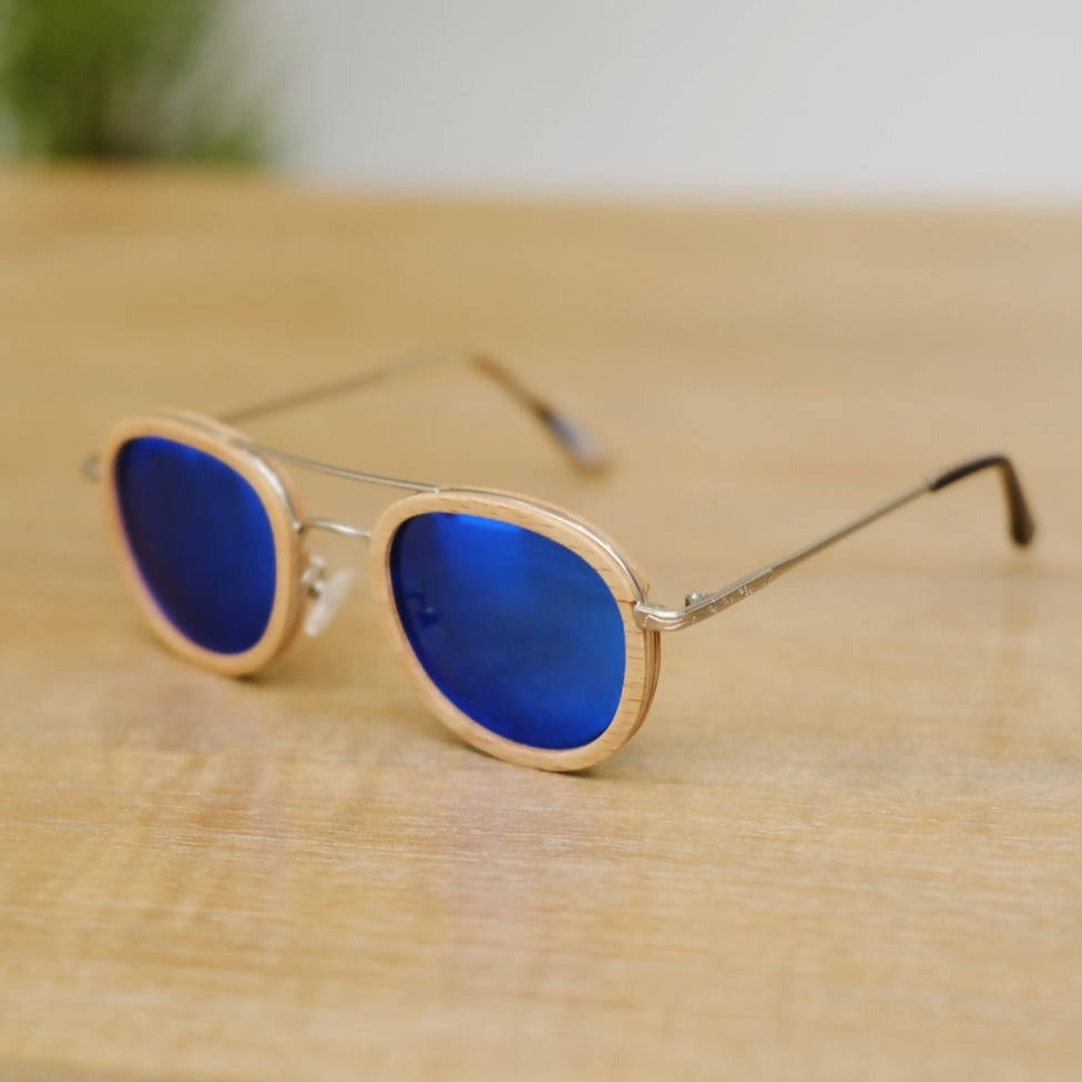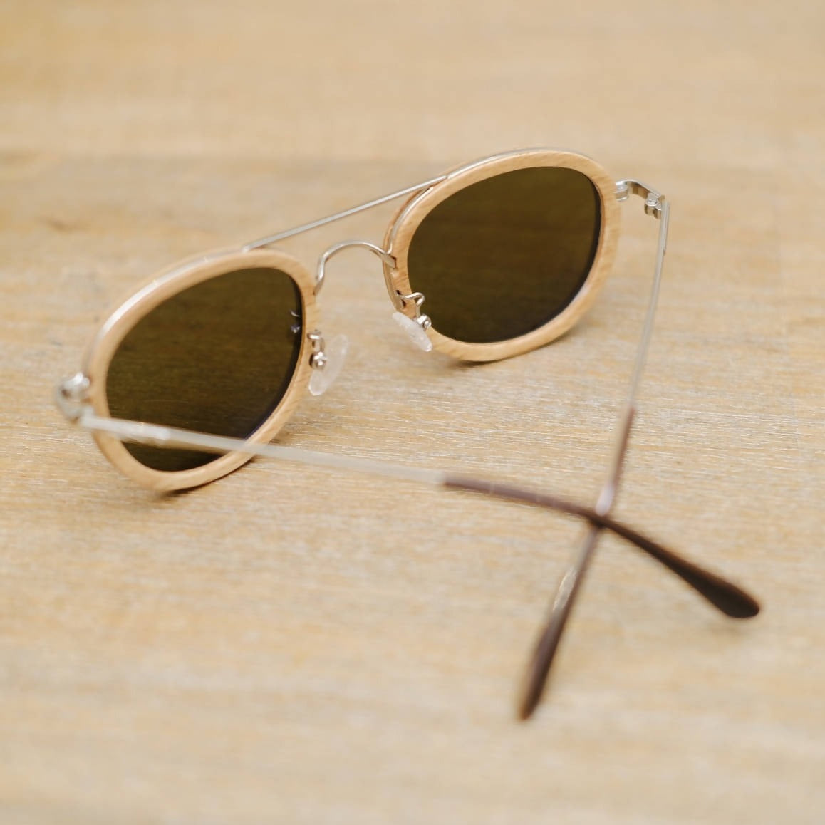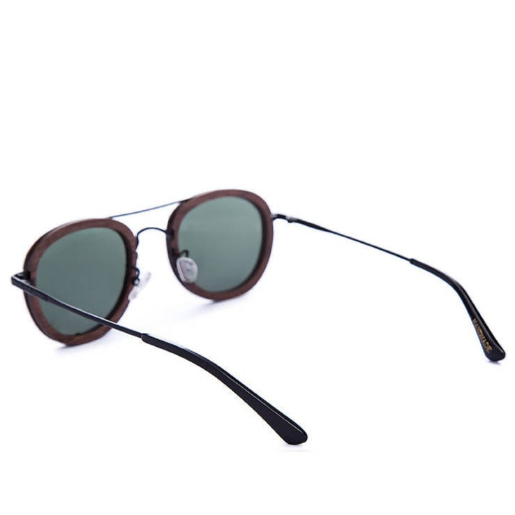 Sustainable wooden round sunglasses. • Made from a stainless steel and ebony/walnut wood combination frame• Double-bar bridge• Metal spring hinges• Acetate end caps • G-15 polarized lenses with built-in UV400 protection Lens - 46 mm | Bridge - 20 mm | Temple - 132 mm