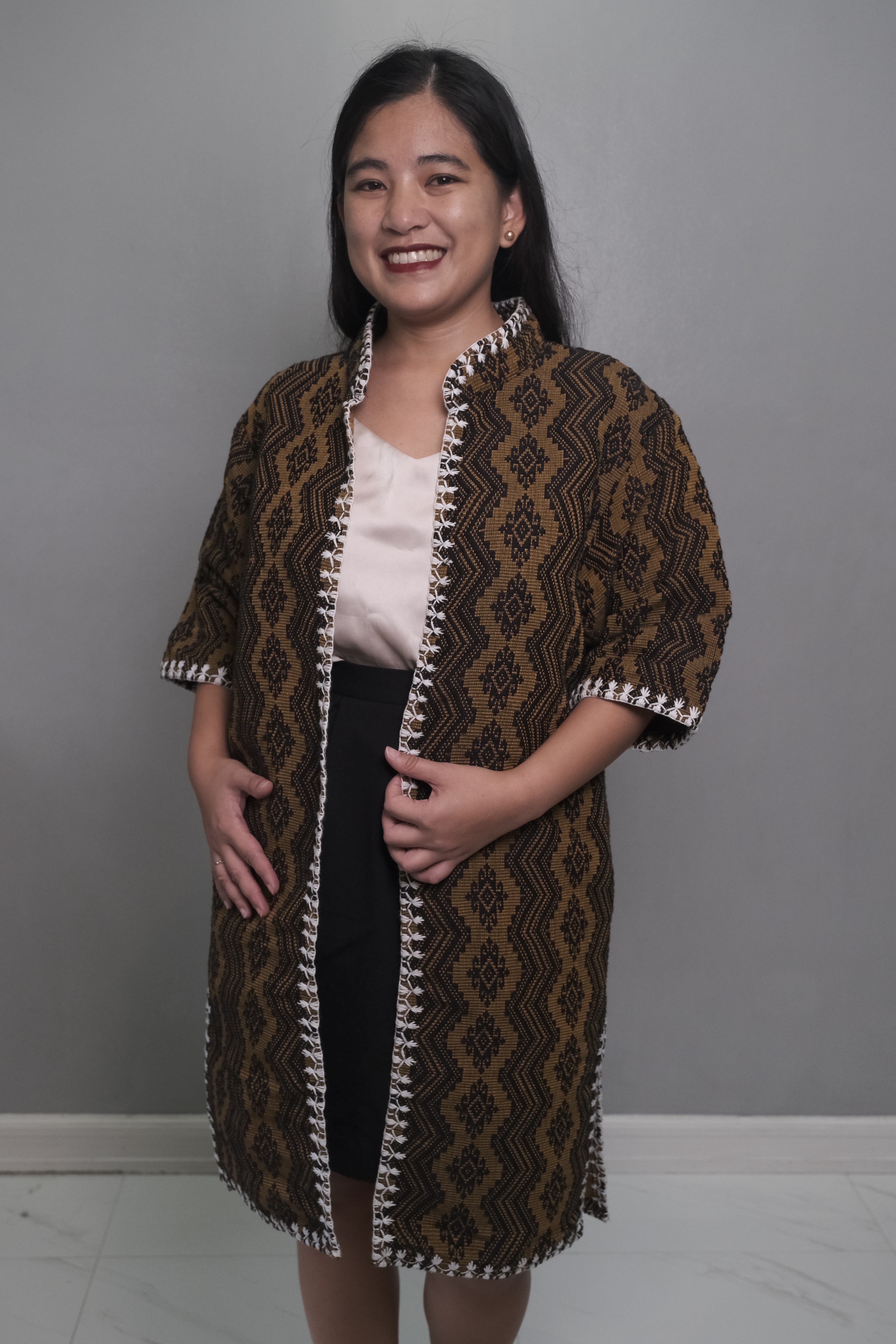 Black and Gold Long Coat with 3/4 sleeves, handmade by Itneg indigenous artisans from Abra Province. With side pockets and mandarin collar. Standout piece for work, events and travel. Suitable for women and men. Proudly Filipino-made.