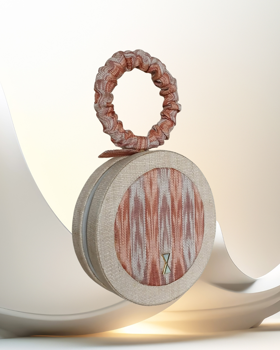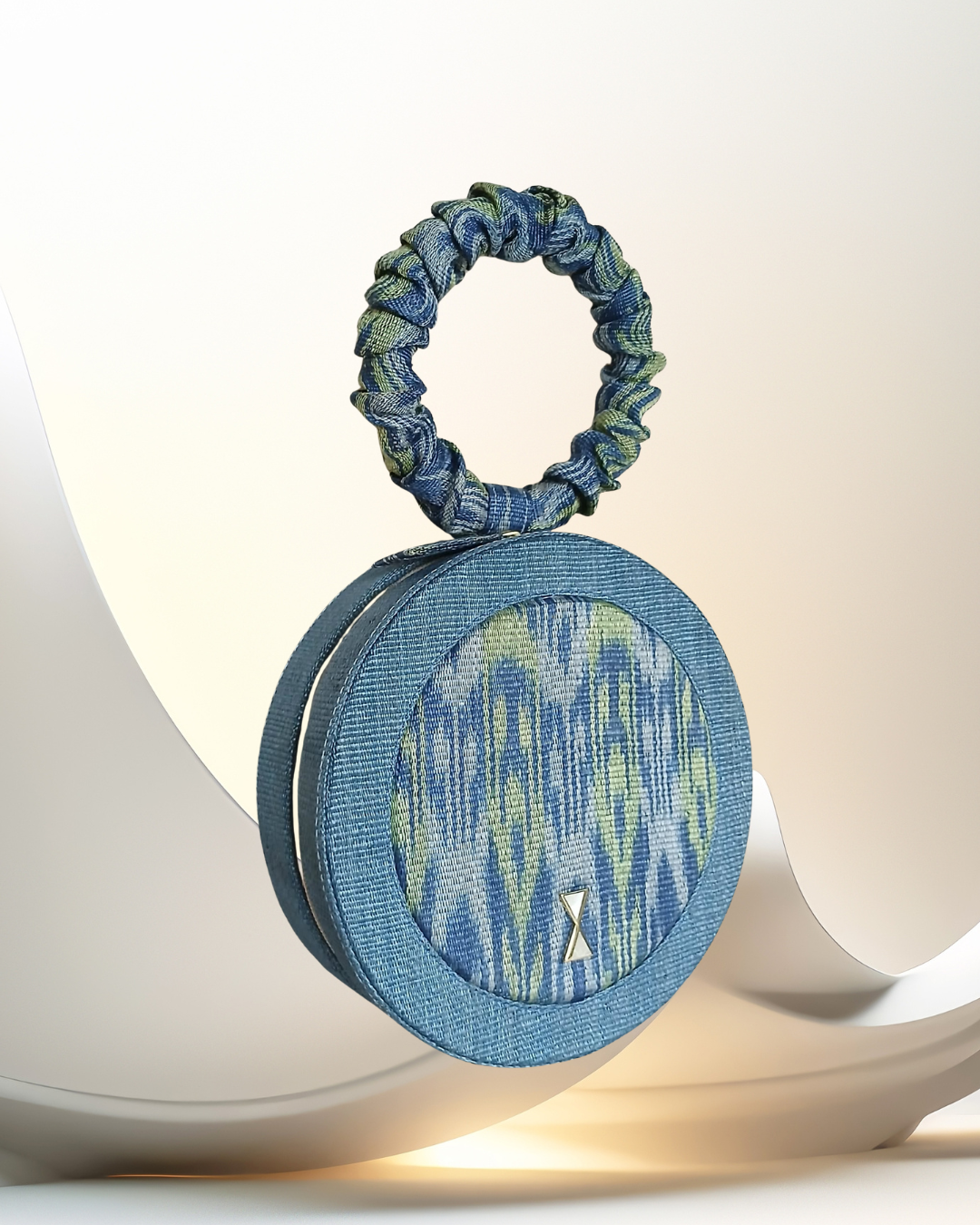 • Embellished with hourglass brand icon in hand-crafted brass with mother-of-pearl inlay Puff wristlet handle in Tboli ikat weave